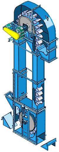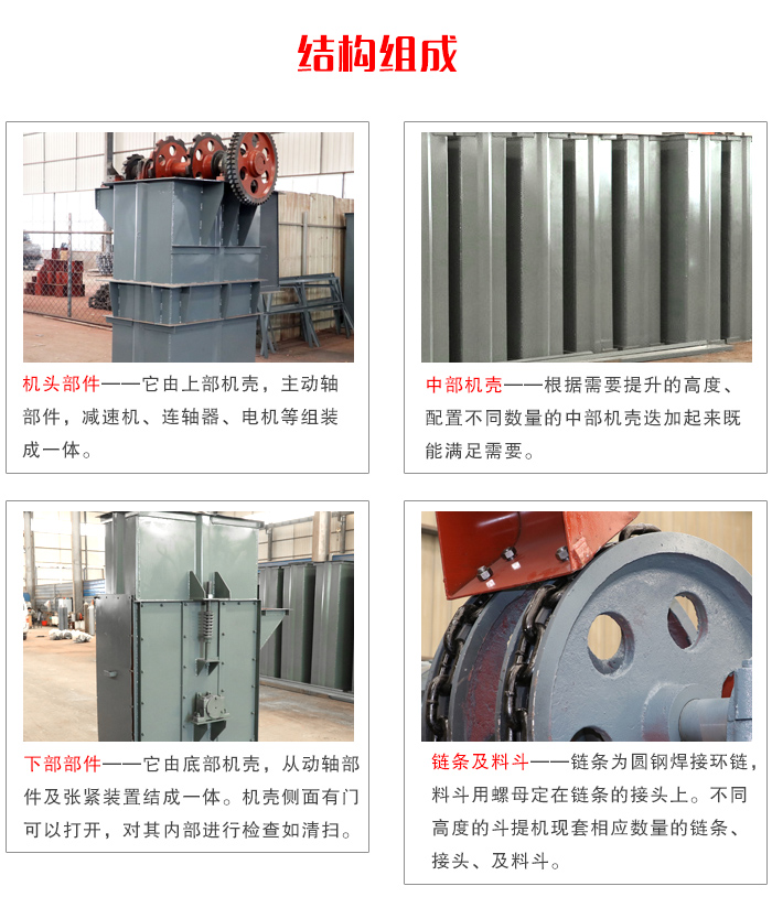 環(huán)鏈斗式提升機適用于垂直輸送磨琢性較大的粉狀、粒狀、及小塊狀物料,如糧食、煤、水泥、碎礦石等,輸送高度高40m,其特點為,結構簡單,運行平穩(wěn),掏取式裝料,混合式或重力卸料,輪緣采用組合鏈輪,更換方便,鏈輪輪緣經特殊處理壽命長,下部如采用重力自動張緊裝置,能保持恒定的張力,避免打滑或脫鏈,同時在料斗遇阻時,有一定的容讓性能夠有效地保護運動部件,物料溫度不超過250℃。